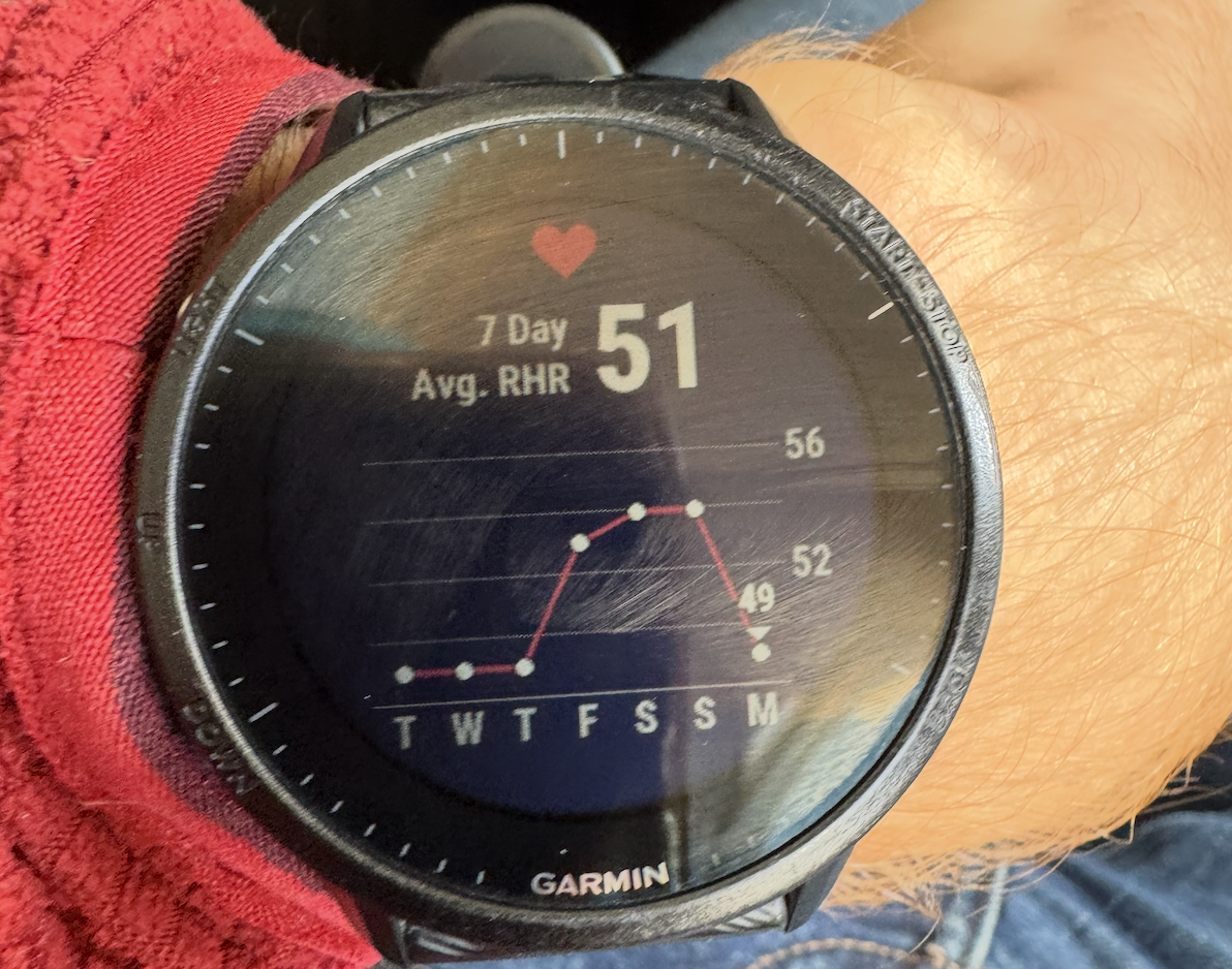 In addition to load we can have a look at Resting Heart Rate, as that is often related to sufficient recovery.
