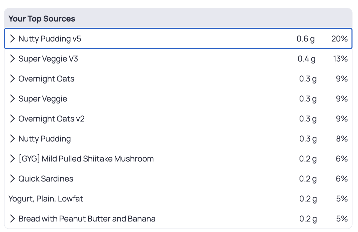 Besides the sardines and yogurt, all leucine is from plant sources; the high amount in Nutty Pudding is due to plant protein.
